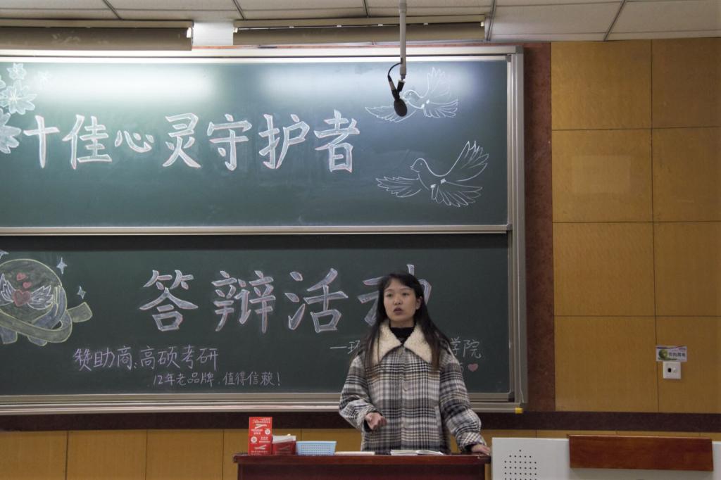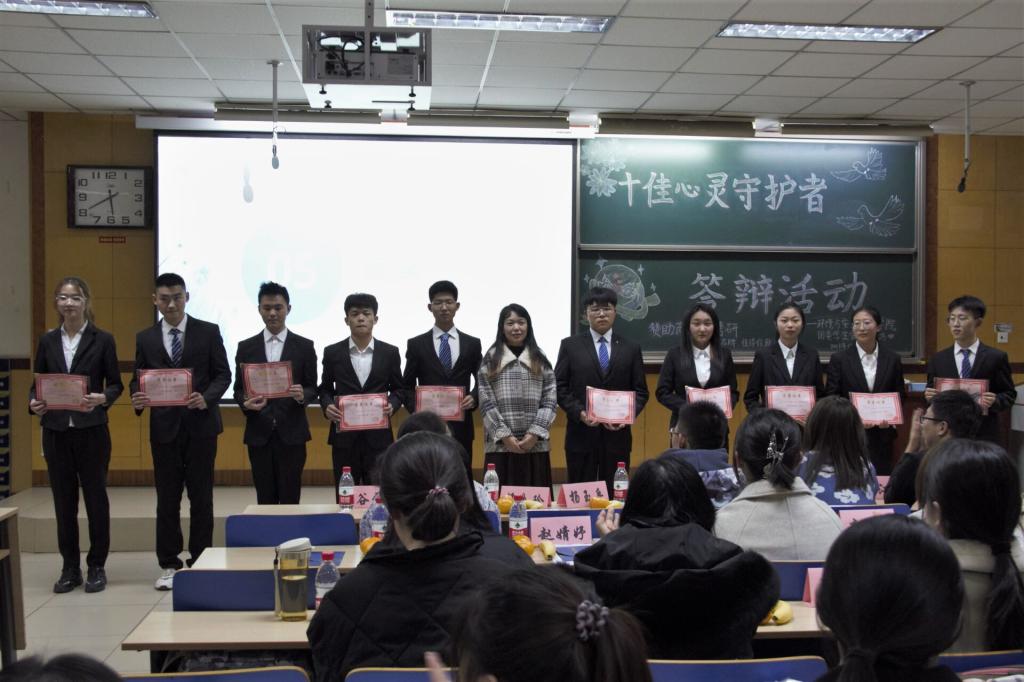 的学生工作取得了令人满意的成绩。此次答辩活动中,他们对大一学年的心理工作和心得做了PPT展示总结。选手们PPT制作精美,语言诙谐流畅,答辩逻辑清晰,介绍了自己的兴趣爱好、工作岗位、成长感悟以及未来展望。他们从初入大学时的迷茫到如今能够独立完成活动策划,尽展个人成长风采,赢得同学们的热烈掌声。答辩休息期间的小游戏和发出的小礼品充分调动了大家的积极性,欢笑频频。经过选手们激烈的角逐,最终程晓颖、龚怡凡、陈雨琪、杨滨滨、李佩佳、刘国正、王伽勒、闫伟、卫政阳、梁乔艺被评选为“十佳心灵守护者”。活动结束前学生科谷磊磊老师上台总结发言,老师对大家提出表扬并给予鼓励,希望大家再接再励,给自己的大学交一个完美的答卷。至此,活动圆满结束。