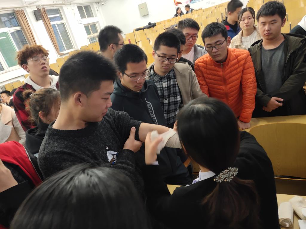 邀请校医院外科孙主任开展外伤紧急处理科普知识讲座。校医院护士长、辅导员赵雅欣、全体生活委员、大一全体宿舍长参加此次讲座。
