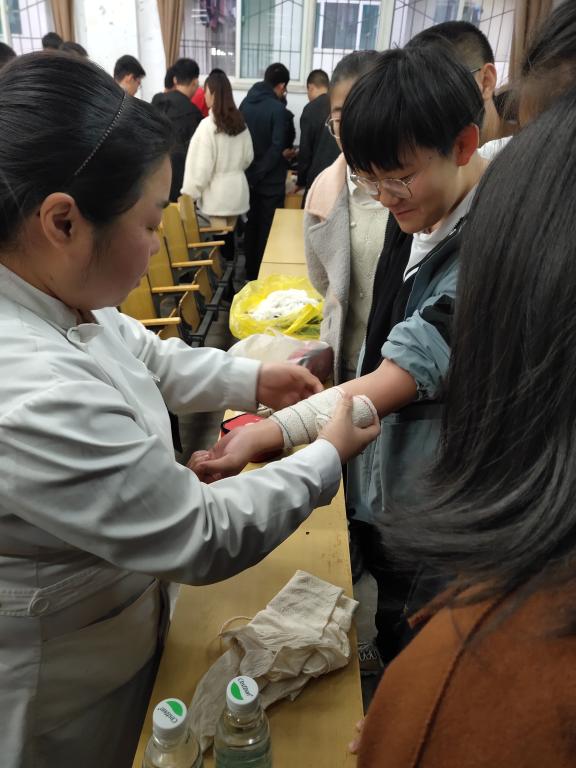 讲座中,孙主任介绍了外伤出血的几种情况,详细讲了头部、手掌、上肢、下肢出血时按压止血的方法和包扎止血方法,以及日常生活中烫伤、扭伤、关节脱位的处理方法。告诫同学们,如果遇到紧急事件,首要先保持冷静,初步处理伤口后,送往医院寻求专业人员处理包扎伤口。随后,孙主任与护士长现场展示了各部位伤口的包扎方法,并指导大家进行练习。