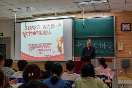 在09103H举办中北大讲堂励志专题讲座。山西省生态环境原副巡视员、省生态环境厅党的二十大精神义务宣讲员、省生态环境厅离退休党总支书记白振兴,应邀为同学们做了《好好学习,努力做一个对社会有用的人》的专题报告。200余名本科生聆听了讲座。