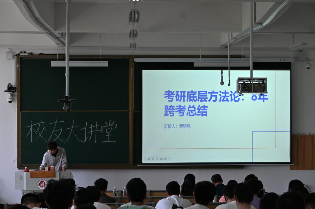 讲座中,罗明亮围绕 “考研历程回溯、跨考专业策略、科学备考方法论” 三大核心板块展开分享。他结合自身北漂实习经历,生动讲述从工科到文科的跨界挑战,细致拆解备考周期规划、时间高效分配、复试应答技巧等关键环节,特别强调 “兴趣驱动” 与 “持续阅读” 的重要性。针对同学们普遍关心的跨考专业适配性、备考心态调节等问题,他以 “功不唐捐,坚持必有所获” 为引,鼓励大家 “将考研视为自我提升的过程而非终极目标”,倡导在专注学业的同时保持多元发展,通过广泛阅读积淀底蕴、明晰人生方向。